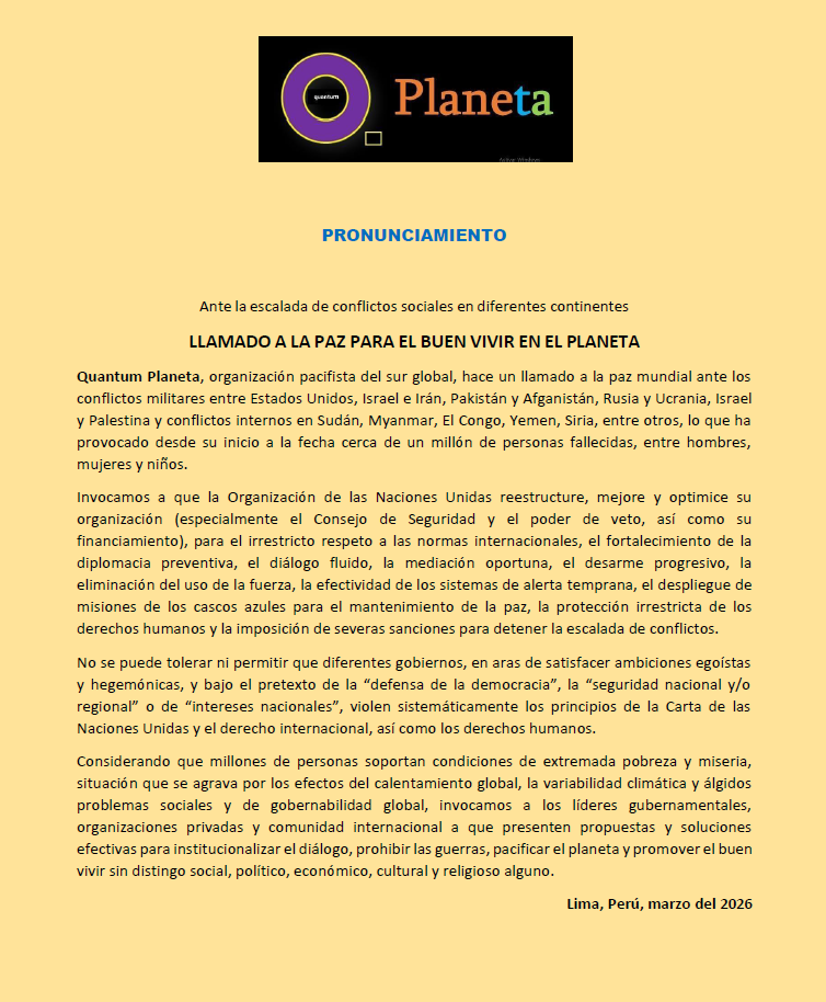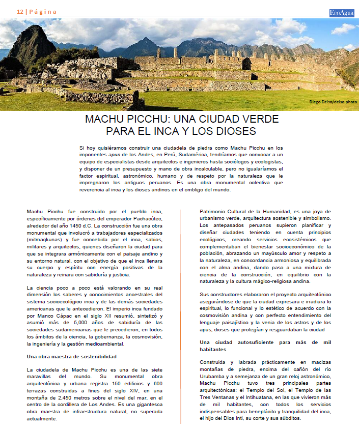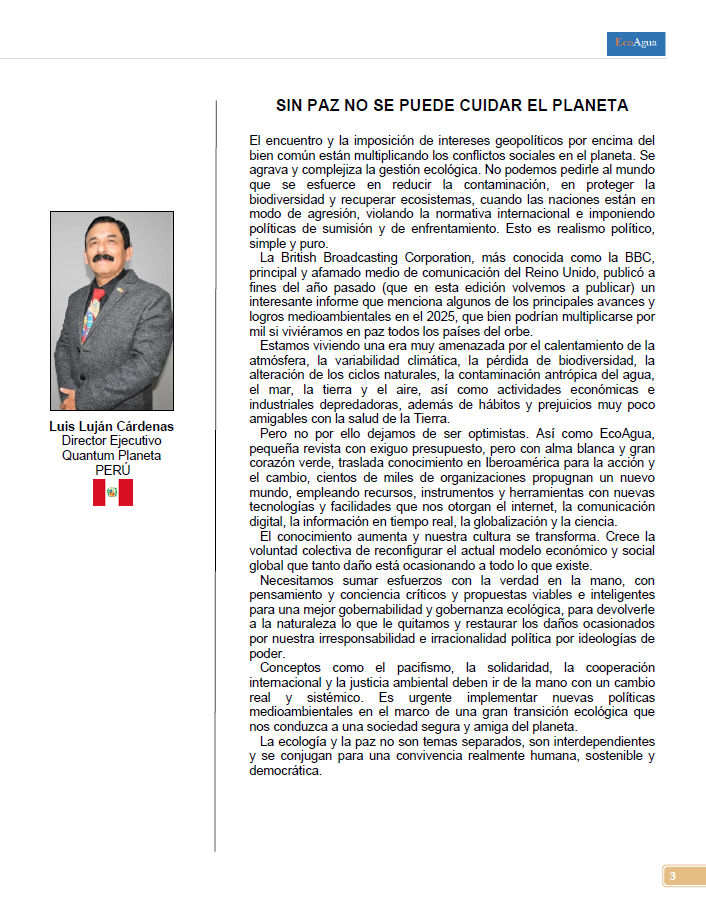 Editorial Pronunciamiento Proyecto Templo de la Tierra y el Agua (Museo Lab) en la Amazonía Colabora Entrevista Alessandra Durand Revista EcoAgua Febrero 2026 Foto Especiales EcoAgua, setiembre 2025, N.2 Video: El Papa León XIV llama a la paz Alianzas Colaboradores Ana SánchezEspaña Andrea MendezCosta Rica Carolina SturnioloArgentina David JiménezColombia Judit AlonsoAlemania Próspero YancePerú Tania GuadalupeMéxico Axel DourojeanniPerú /Chile Belén AlejandraArgentina Eva TorremochaEspaña Francesc CortadaEspaña Gonzalo de la FuenteEspaña Ingrid ZúñigaPerú Liliana EscalanteEstados Unidos Donación de medicinas a comedor de ancianos en Lima. Setiembre 2025